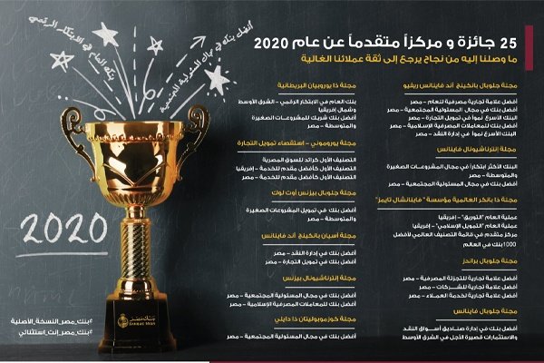 وأشار البيان إلى أن البنك تحصّل على لقب “أفضل بنك في تمويل المشروعات الصغيرة والمتوسطة – مصر 2020” من مجلة جلوبال بيزنس أوت لوك، بالإضافة إلى جائزة “البنك الأكثر ابتكارا في مجال المشروعات الصغيرة والمتوسطة – مصر 2020” من مجلة إنترناشيونال فاينانس، كما حصل البنك على جائزة “أفضل بنك شريك للمشروعات الصغيرة والمتوسطة – مصر 2020” من مجلة ذا يوروبيان البريطانية.