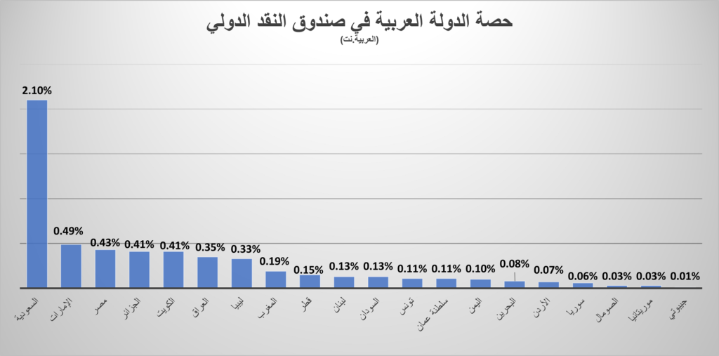 ووفقا لبيانات صندوق النقد الدولي تعد المملكة العربية السعودية أكبر دولة عربية تحصل على حقوق سحب خاصة بـ 9577.5 مليون وحدة سحب خاصة، وتبلغ حصتها التصويتية 02.1 في المائة، وفي المرتبة الثانية تأتي الإمارات بإجمالي 2125.2 مليون وحدة سحب، وحصتها التصويتية 0.49 في المائة، ثم مصر بالمرتبة الثالثة بحجم 1952.5 وحصتها التصويتية، 0.43 في المائة.