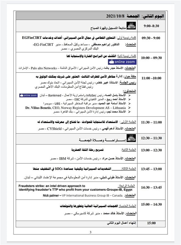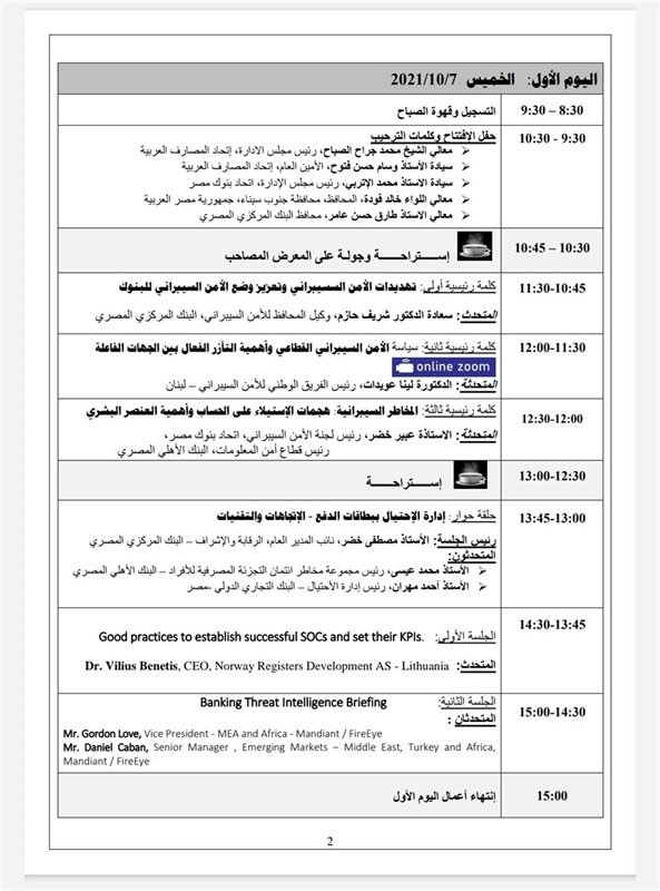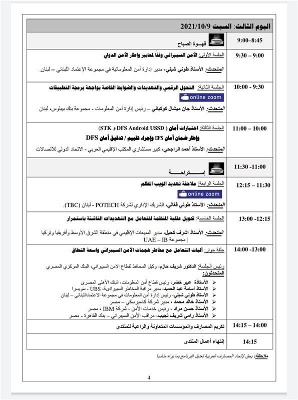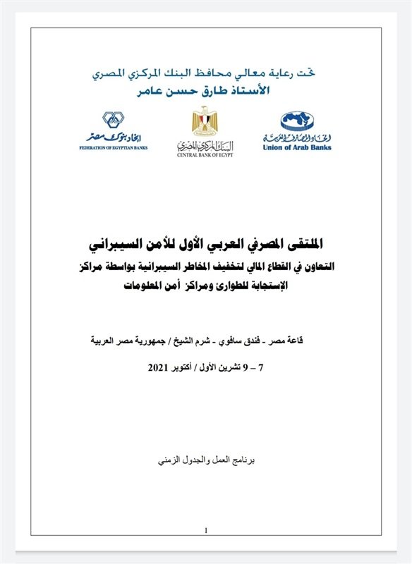 يبرم إتحاد المصارف العربية بالتعاون مع البنك المركزي المصري وإتحاد بنوك مصر “الملتقي المصرفي العربي الأول للأمن السيبراني”، فى فندق جراند روتانا- شرم الشيخ، جمهورية مصر العربية ولمدة ثلاث أيام، خلال الفترة من يوم الخميس الموافق للسابع من تشرين الأول ولغاية يوم السبت التاسع من تشرين الأول، برعاية طارق عامر محافظ البنك المركزي المصري وبمشاركة أكثر من 250 مشارك من قيادات البنوك العربية وكبرى الشركات الإقليمي والدولية المتخصصة فى مجال الأمن السيبراني.