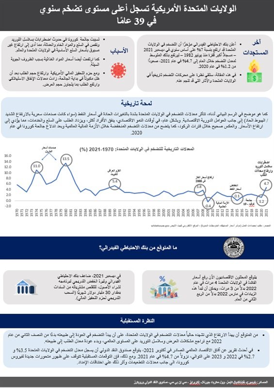 كشف بنك الاحتياطي الفيدرالي الأمريكي في تقرير صادر مؤخرا أن التضخم في الولايات المتحدة قد إرتفع بنسبة 07.0 في المائة على أساس سنوي في ديسمبر المنقضي، مسجلا أكبر قفزة منذ يونيو 1982 في 39 عاما، ليرتفع بذلك المتوسط لمعدل التضخم خلال العام إلى 04.7 في المائة في العام المنقضي، صعودا من 01.2 في المائة في عام 2020.