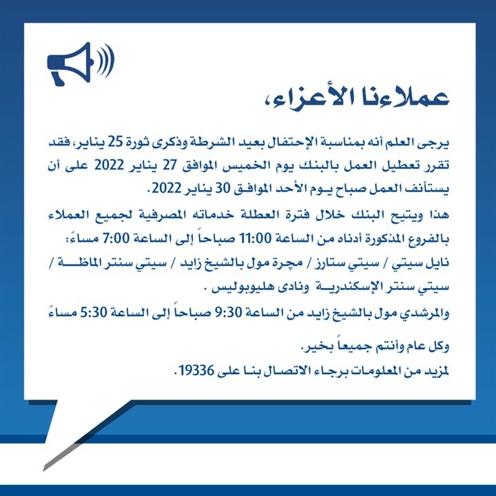 وأكد البنك على موقع التواصل الاجتماعي “فيس بوك”، لعملائه أنه سوف يتيح خلال فترة العطلة خدماته المصرفية لجميع العملاء من الساعة 11 صباحا إلى 7 مساء بفروع نايل سيتي، وسيتي ستارز، ومجرة ومول بالشيخ زايد، وسيتي سنتر ألماظه، وسيتي سنتر الإسكندرية، ونادي هليوبوليس، بالإضافة إلى المرشدي مول بالشيخ زايد من الساعة 9.30 صباحا وحتى الساعة 5.30 مساء.ذ