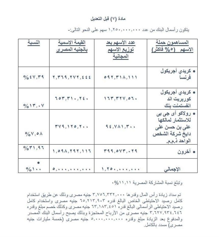 وبين البنك أن سبب التعديل هو تعديل عنوان البنك طبقا للتقسيم الوارد من الهيئة العامة للمجتمعات العمرانية – جهاز القاهرة الجديدة في 20/9/2021، وفيما يلي المادة رقم /7/ قبل وبعد التعديل المقترح.