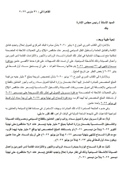 كما مدد فترة السماح الواردة بمبادرة سداد الرواتب والأجور والالتزامات القائمة لدى الموردين وأعمال الصيانة للأنشطة السياحية وذلك في إطار مبادرة إحلال وتجديد الفنادق بسعر عائد 08.0 في المائة متناقص، حتى نهاية ديسمبر 2022 بدلا من ديسمبر 2021.