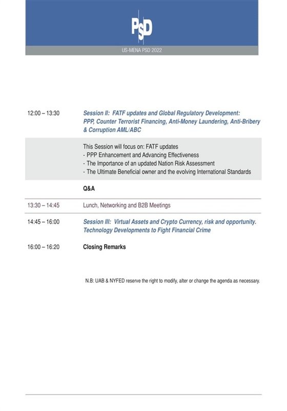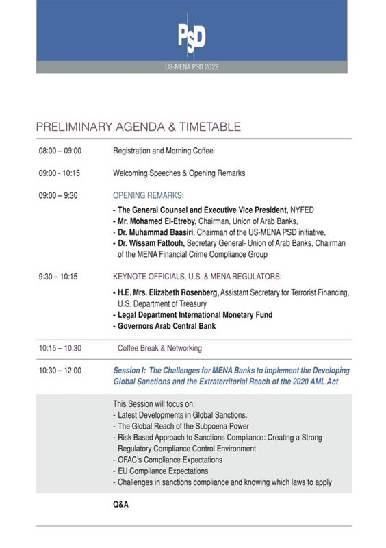 تستضيف نيويورك أعمال المؤتمر في 12 تشرين الأول 2022 ، وستتحدث خلاله اليزابيث روزنبرج مساعد وزير الخزانة الامريكية لمكافحة غسيل الأموال وتمويل الإرهاب في حوار مباشر مع المصارف العربية.