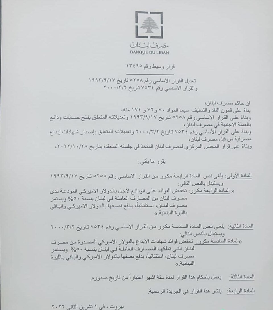 حصلت بنوك عربية على وثيقة مسربة عن مصرف لبنان لم يتسنى التأكد من صحتها، تحمل قراراً وسيطاً حمل الرقم 13495، خفض بموجبه الفوائد على الودائع لأجل بالدولار المودعة من قبل المصارف بنسبة 50%.