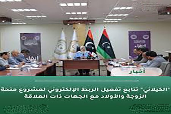 استعرضت وزيرة الشؤون الاجتماعية بحكومة الوحدة الوطنية الليبي الموقتة وفاء الكيلاني آليات تفعيل الربط الإلكتروني لمشروع منحة الزوجة والأولاد، الذي جرى إنجازه بالتعاون مع مصلحة الأحوال المدنية، وذلك بهدف ضمان دقة البيانات، وضبط الإجراءات، وتعزيز الشفافية في إيصال المنحة إلى مستحقيها دون تأخير أو ازدواجية.