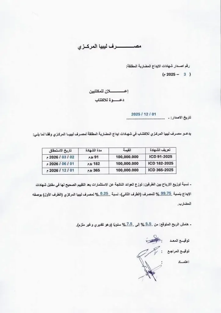 ودعا مصرف ليبيا المركزي المصارف التجارية الليبية إلى الاكتتاب في الإصدار الأول من شهادات إيداع المضاربة المطلقة التي تم إصدارها أمس الأحد الموافق لـ 12 أكتوبر/ تشرين الأول 2025 وفق المدد وتواريخ الإستحقاق الموضحة في إعلان الاكتتاب المرفق لكل نوع، منوهًا “بأن تاريخ الإصدار الأول سيكون يوم الأحد الموافق 2 نوفمبر/ تشرين الثاني 2025 بقيمة 5 مليار دينار ليبي”.