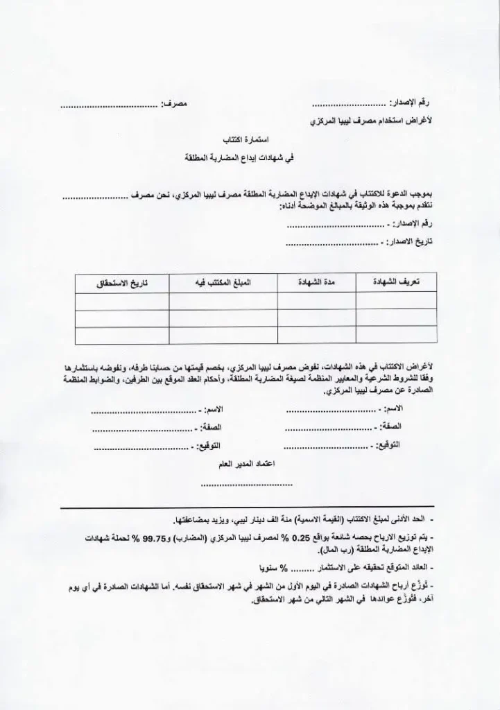 وتوضح الاستمارة أنه سيجري توزيع الأرباح بحصة شائعة بواقع 0.25% لمصرف ليبيا المركزي «المضارب» و99.75% لحملة شهادات الإيداع المضاربة المطلقة «رب المال».