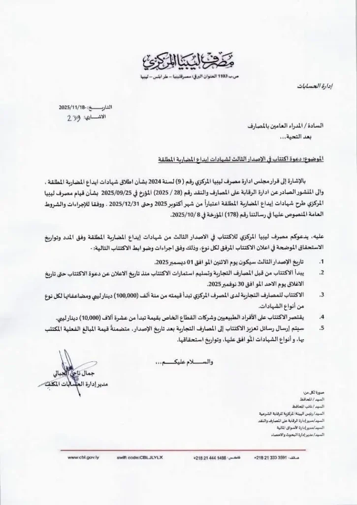 وفي 9 نوفمبر/ تشر ين الثاني الجاري 2025 دعا مصرف ليبيا المركزي، المصارف التجارية إلى الاكتتاب في الإصدار الثاني لشهادات إيداع المضاربة المطلقة التي أطلقها المصرف بداية الشهر الماضي، وذلك وفق المدد وتواريخ الاستحقاق المحددة في إعلان الاكتتاب الذي نشره عبر صفحته على موقع التواصل الإجتماعي “فيسبوك”.