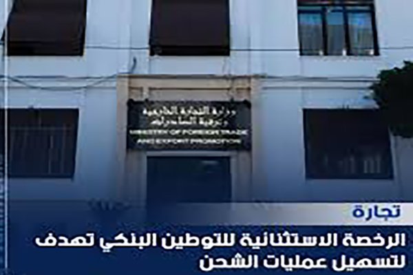 أكدت وزارة التجارة الخارجية وترقية الصادرات بالجزائر أن الرخصة الاستثنائية المتعلقة بالتوطين البنكي تهدف حصرياً إلى تسهيل عمليات الشحن (FRET)، وذلك في توضيح أصدرته رداً على ما تم تداوله من طرف جمعية البنوك والمؤسسات المالية (ABEF) بالجزائر بشأن إجراءات التوطين.