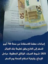 أصدر بنك الجزائر المركزي، أمس الأحد الموافق لـ 07 نوفمبر/ تشرين الثاني 2025، بياناً تذكيرياً يوضح فيه الضوابط المعمول بها للاستفادة من حق الصرف المخصص للسفر إلى الخارج، وذلك عقب قرار رئيس الجمهورية القاضي برفع القيمة إلى 750 يورو للبالغين و300 يورو للقُصّر.