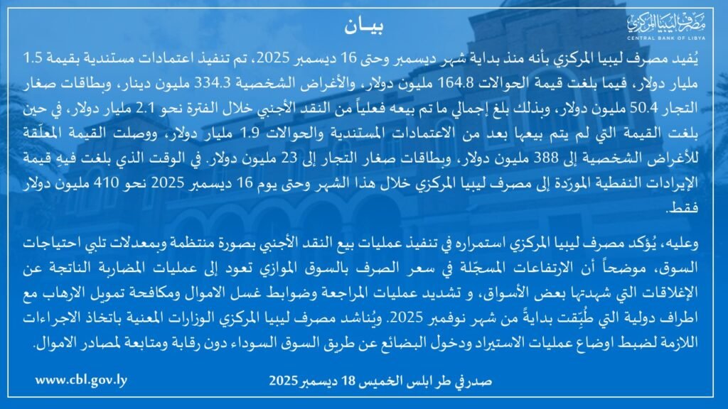 كشف مصرف ليبيا المركزي عن تنفيذه اعتمادات مستندية بقيمة 1.5 مليار دولار، منذ بداية شهر ديسمبر/ كانون الأول وحتى 16 ديسمبر/ كانون الأول 2025، فيما بلغت قيمة الحوالات 164.8 مليون دولار، والأغراض الشخصية 334.3 مليون دينار، وبطاقات صغار التجار 50.4 مليون دولار.