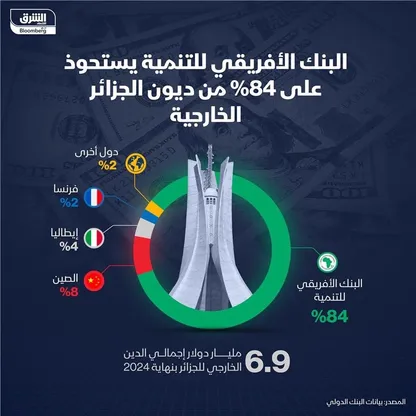 بنوك عربية: تستحوذ مجموعة البنك الإفريقي للتنمية على الحصة الأكبر من ديون الجزائر الخارجية بنسبة 84%، بحسب بيانات البنك الدولي.