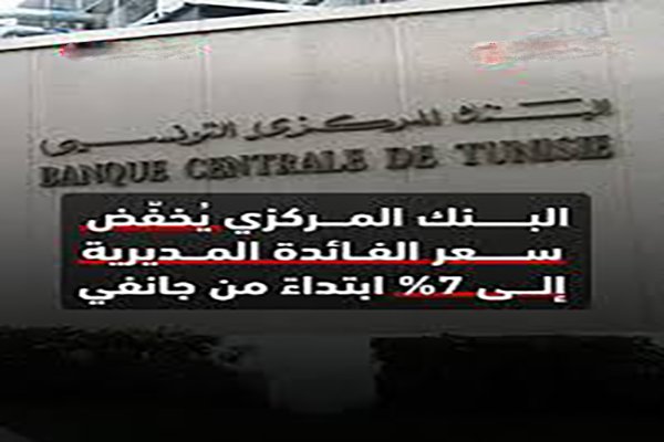 قرّر مجلس إدارة البنك المركزي التونسي، إثر اجتماعه المُنعقد أمس الثلاثاء 30 ديسمبر 2025، تخفيض سعر الفائدة المديرية بـقيمة 50 نقطة أساس لتصل بذلك إلى 7%، على أن يسري هذا القرار ابتداءً من 07 يناير/ جانفي 2026.