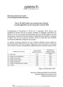 في سياق آخر، أعلن بنك الجزائر، بموجب التعليمة رقم 02-2025، عن تحديد عتبات معدلات الفائدة المفرطة المطبقة خلال السداسي الأول للعام المالي 2026، وذلك استنادًا إلى معدلات الفائدة الفعلية المتوسطة المسجلة خلال السداسي الثاني لسنة 2025، وفقًا لأحكام التعليمة رقم 08-16 المؤرخة في 01 سبتمبر 2016.