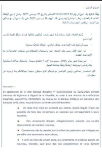 منح بنك الجزائر المركزي مهلة شهر واحد للتجار والمؤسسات للتأقلم مع قرار منع إيداع المبالغ ماليا نقدا في حساباتهم البنكية، واعتماد الدفع الإلكتروني، رسميا، في العمليات ذات صلة -وذلك بناء على مذكرة تحمل رقم 02/DGIG/2025، والمؤرخة في 22 ديسمبر 2025، وتتعلق بتدابير اليقظة تجاه العملاء- وعلى إثر اجتماع توضيحي عُقد بتاريخ 30 ديسمبر 2025 بحضور ممثلي البنوك، تم تقديم توضيحات مهمة حول موعد دخول التعليمة حيز التطبيق.