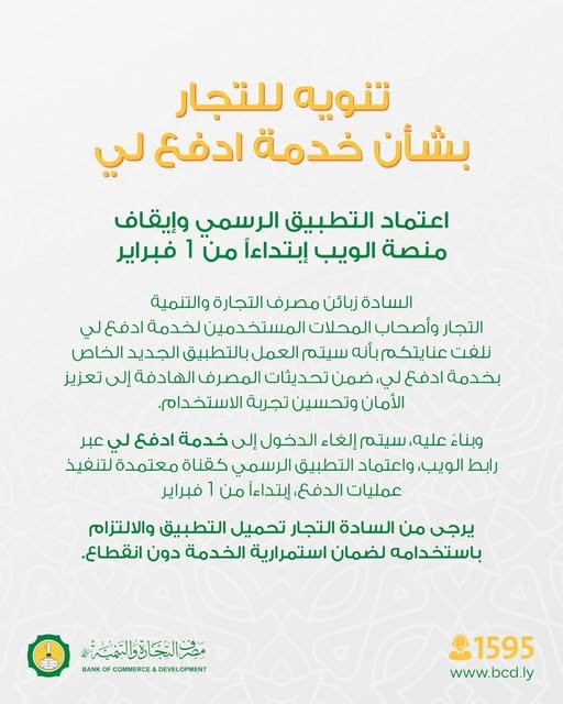 وبناءً عليه، سيجري إيقاف إمكانية الدخول إلى خدمة «ادفع لي» عبر رابط الويب، مع اعتماد التطبيق الرسمي للمصرف كقناة وحيدة ومعتمدة لتنفيذ عمليات الدفع، وذلك إعتبارًا من 01 فبراير 2026.