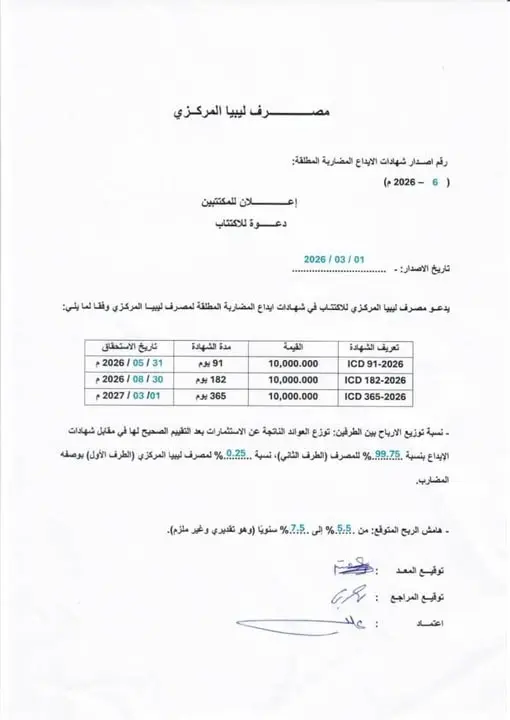 دعا مصرف ليبيا المركزي المصارف التجارية الليبية للاكتتاب في الإصدار رقم (6-2026) من شهادات الإيداع المضاربة المطلقة، وفقًا للإجراءات والضوابط المعتمدة في الإصدارات السابقة.