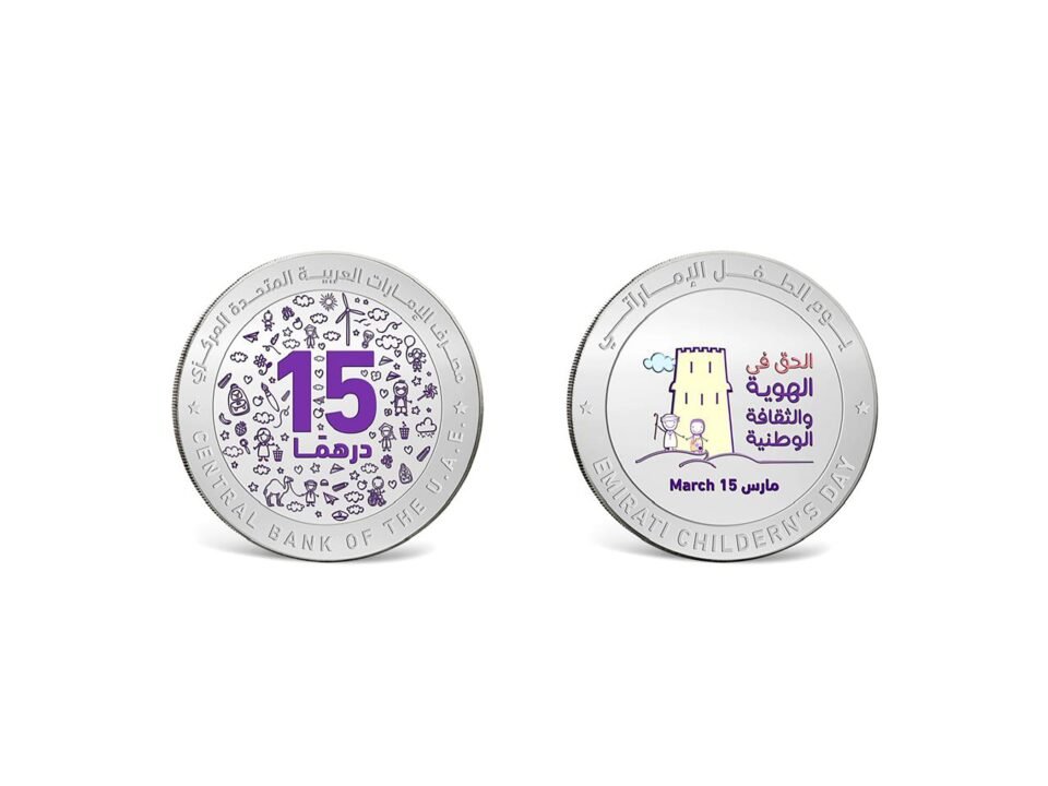 أصدر مصرف الإمارات العربية المتحدة المركزي مسكوكة تذكارية من الفضة احتفاء بيوم الطفل الإماراتي، الذي يوافق يوم 15 مارس من كل عام.
