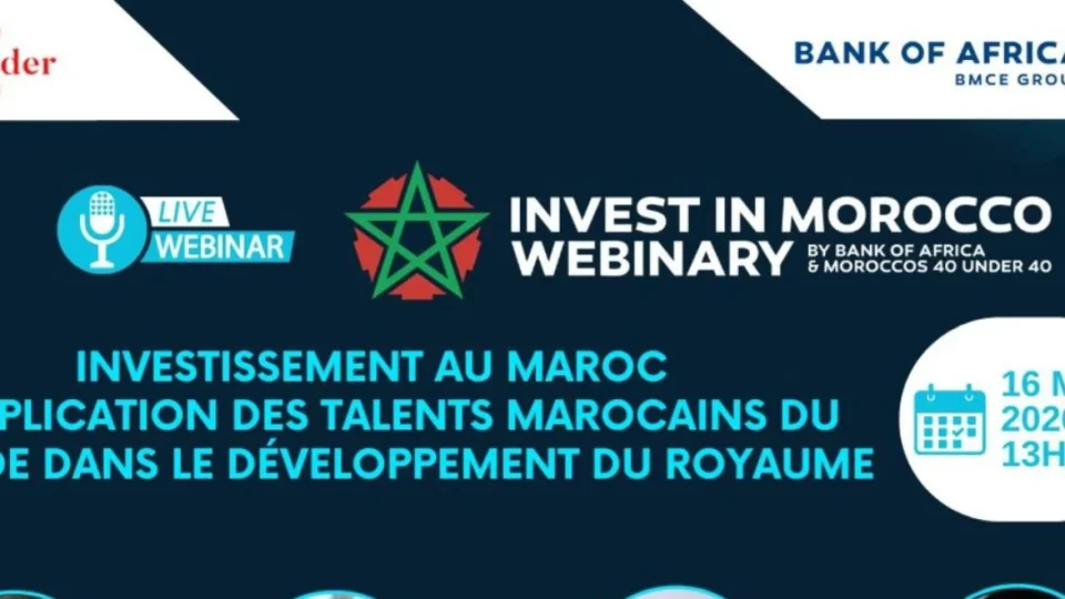 نظّم بنك إفريقيا، في 16 مارس، النسخة الأولى من سلسلة ندواته الرقمية الجديدة تحت عنوان “Invest in Morocco Webinary”، وذلك بشراكة مع مبادرة “Morocco’s 40 under 40”. وقد جمع هذا الحدث الافتراضي نحو خمسين مشاركًا حول موضوع استراتيجي يتمثل في الاستثمار في المغرب ودور كفاءات المغاربة المقيمين بالخارج في دعم تنمية المملكة.