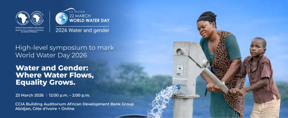 تعقد مجموعة البنك الإفريقي للتنمية ندوة بمناسبة اليوم العالمي للمياه 2026 اليوم الاثنين 23 مارس، تحت شعار “المياه والمساواة بين الجنسين: حيثما تتدفق المياه، تنمو المساواة“.