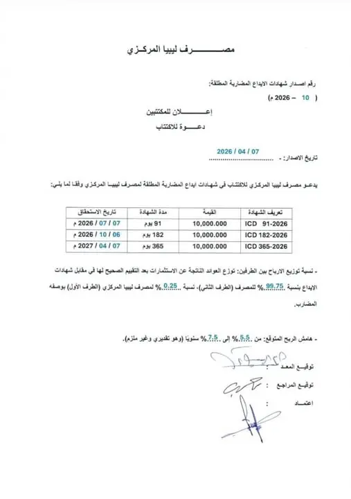 دعا مصرف ليبيا المركزي اليوم الخميس الموافق لـ 02 إبريل 2026، دعوته للمصارف التجارية للاكتتاب في الإصدار رقم/ 10/ لعام 2026 من شهادات الإيداع المضاربة المطلقة، وفق الإجراءات والضوابط المعتمدة في الإصدارات السابقة، وبحسب المدد وتواريخ الاستحقاق المحددة في إعلان الاكتتاب.