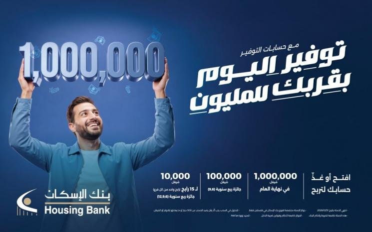 أطلق بنك الإسكان حملته الترويجية لحسابات التوفير لعام 2026 تحت شعار “توفير اليوم.. بقربك للمليون”، متضمنة جائزة كبرى بقيمة مليون شيقل تُمنح لرابح واحد مع نهاية العام، ضمن حزمة جوائز إجمالية تبلغ 1.65 مليون شيقل.