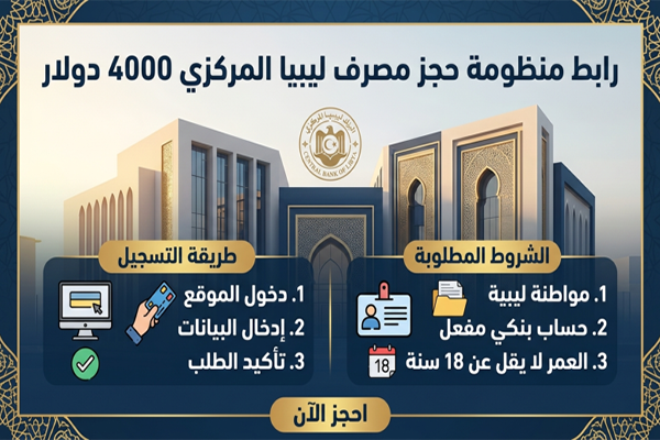 أعاد مصرف ليبيا المركزي تفعيل منظومة حجز النقد الأجنبي للأغراض الشخصية في ليبيا لعام 2026 بقيمة 4000 دولار أمريكي، مما يتيح للمواطنين الحصول على مخصصاتهم بسهولة عبر منصة إلكترونية موحدة. تهدف الخدمة لتقديم تجربة سريعة وشفافة، مع التأكيد على ضرورة اتباع الخطوات بدقة لتجنب رفض الطلب.