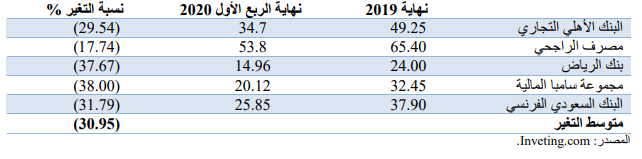 كما تأثرت القيمة السوقية للمصارف السعودية بأزمة جائحة كورفيد-19 المستجد، حيث بلغ متوسط الخسارة للقيمة السوقية لأكبر 05 مصارف سعودية حوالي 30.9 في المائة.