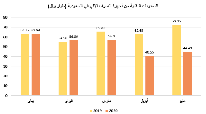 وأكدت بيانات “ساما” الحديثة أن السحوبات النقدية من أجهزة الصرف الآلي خلال شهر مايو الماضي قد هبطت بنسبة 38 في المائة لتصل إلى نحو 44.5 مليار ريال سعودي، مقارنة بسحوبات مايو 2019 والتي بلغت 72.25 مليار ريال سعودي.