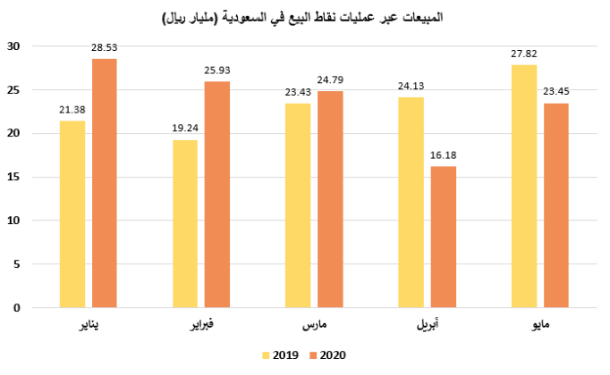 سجلت قيمة المبيعات عبر نقاط البيع في السعودية تراجعا خلال شهر مايو المنقضي بنسبة 16 في المائة لتصل قيمتها الإجمالية إلى نحو 23.5 مليار ريال سعودي مقارنة ﺑ27.8 مليار ريال سعودي خلال الفترة نفسها من العام السابق.